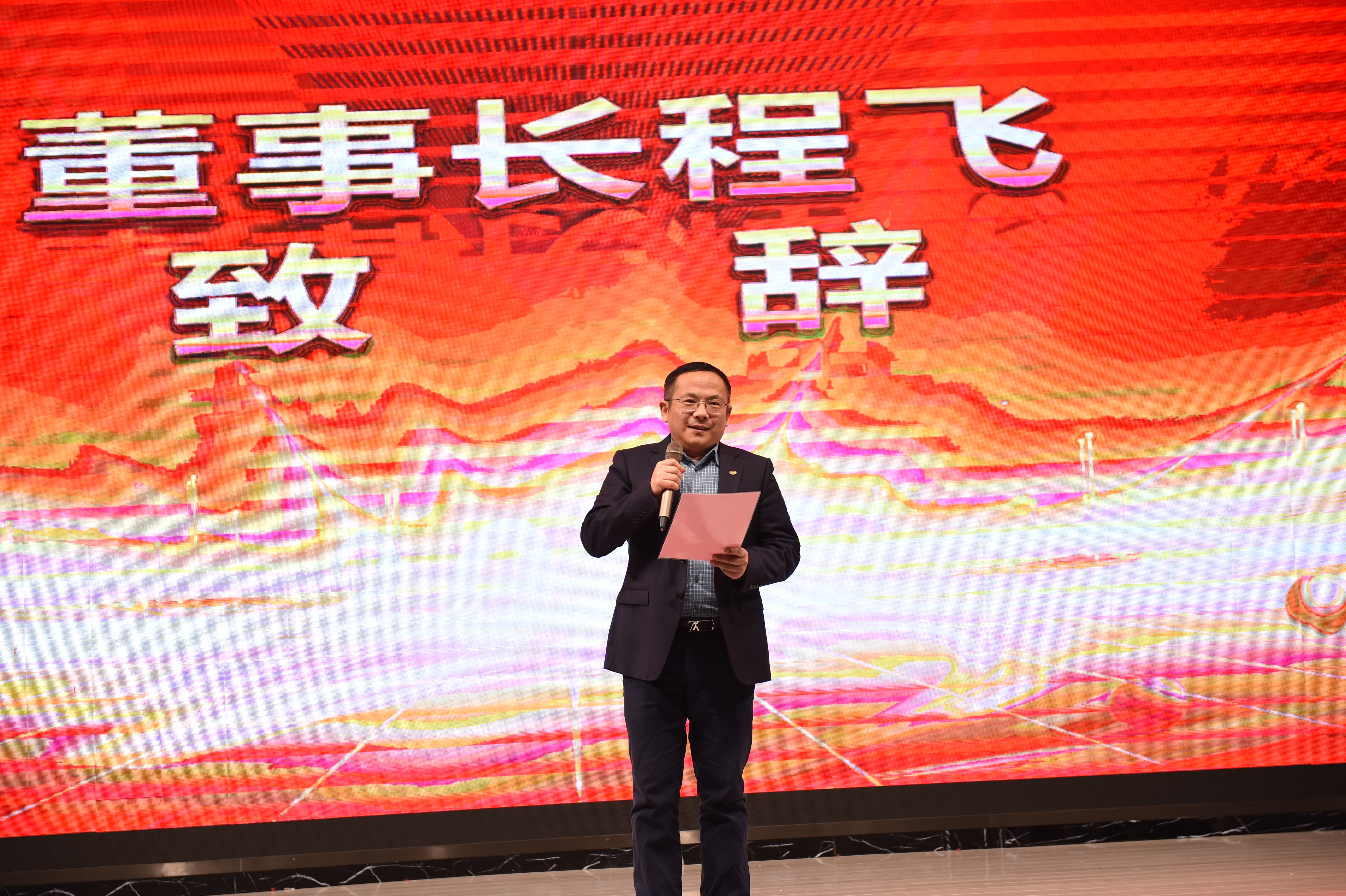 年會及頒獎典禮開始前,由公司董事長程飛先生進行了慷慨激昂的發言,董事長首先對公司全體員工致以最誠摯的祝福和熱烈的問候,其次對新的一年向大家提出了建設性意見,希望公司在全體員工的共同努力下,能以精益至臻、與時俱進的面貌迎接新的挑戰。最后,董事長宣布此次年會及頒獎典禮正式開始!